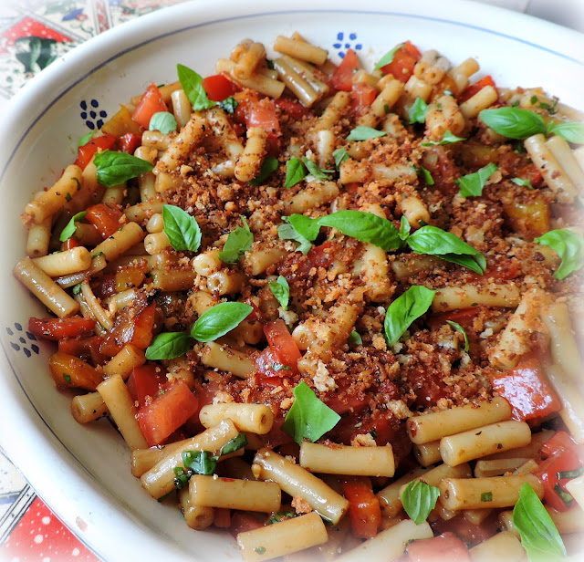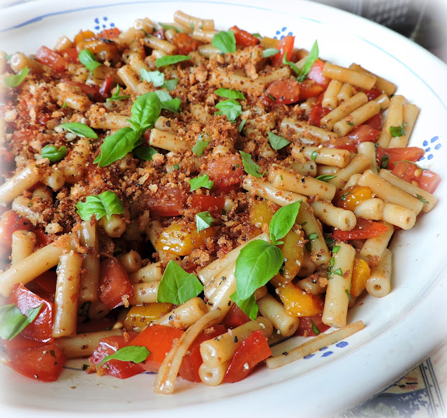 A simple macaroni salad which makes the best of our summer's bounty, with a lovely balsamic vinaigrette,  and a crisp garlic bread crumb topping.