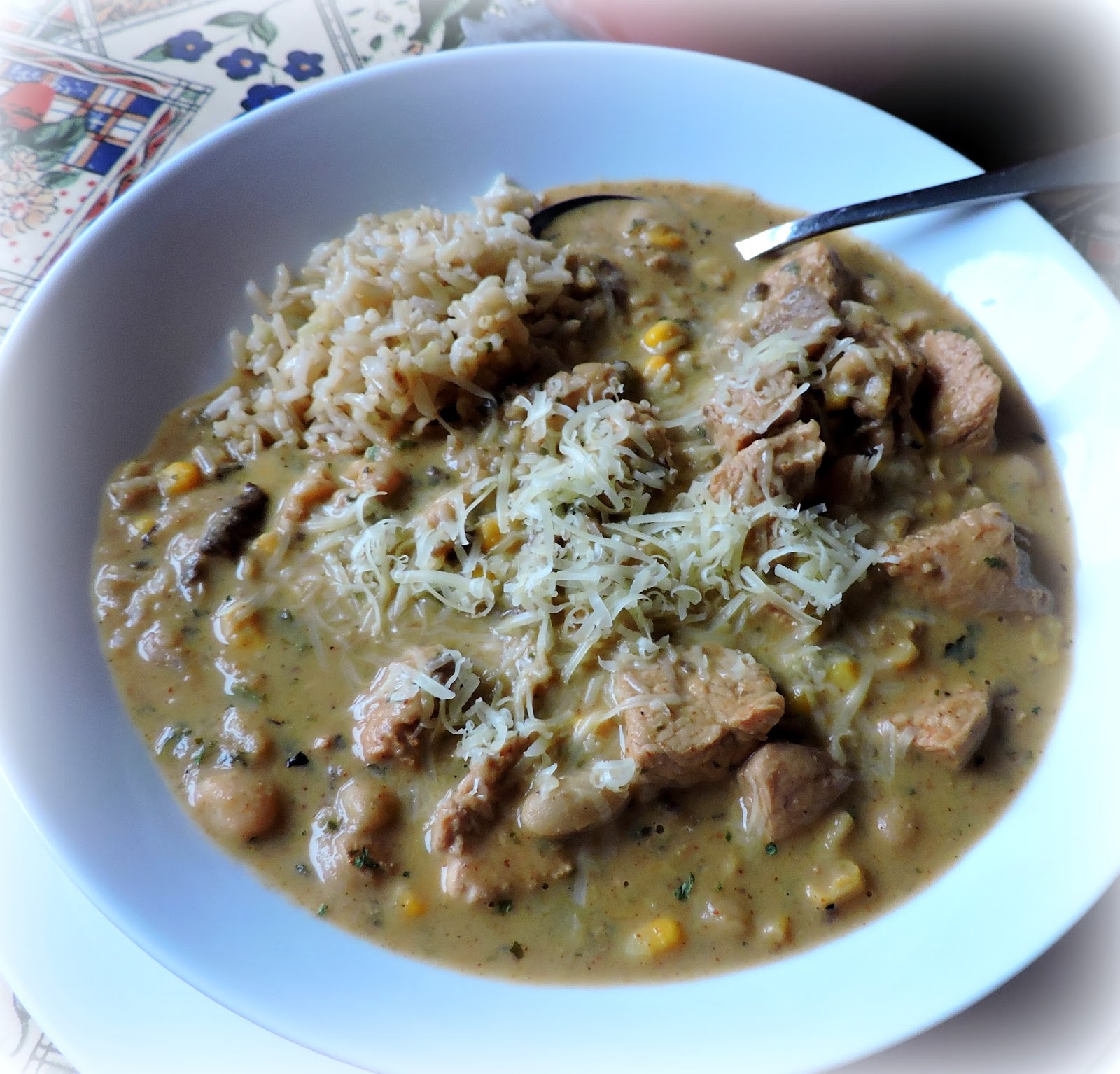 This is so simple to make and uses only a few store cupboard ingredients . . .  onions, a green chili, some dried herbs and spices, tinned beans, some frozen corn and mushrooms, the turkey of course, and some tinned white cannellini beans.  Oh and some low fat sour cream, although in all truth low far Greek yogurt would also work well.