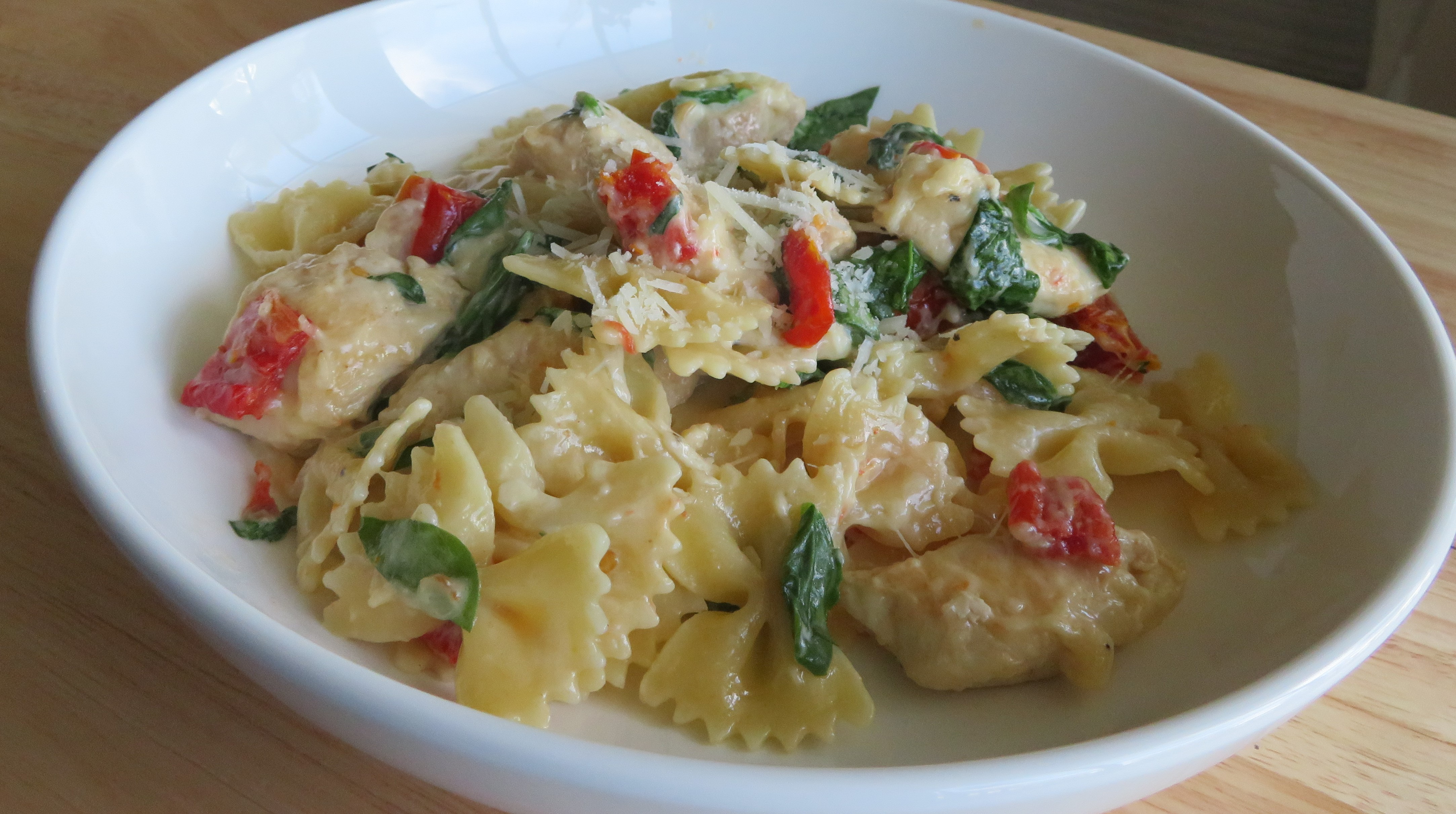 Pasta, sun dried tomatoes, baby spinach, chicken, garlic, cream, and cheese.  I have also always kept a healthy assortment of spices and seasonings.