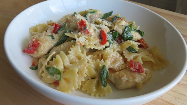 1. Trim the chicken and then cut it into bite sized pieces.  Place into a small bowl.  Chop the spinach and the sun-dried tomatoes.  Place a pot of salted water on to boil for the pasta.